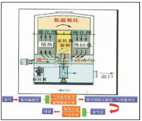 蓄热式催化氧化装置结合蓄热式热力氧化及触媒氧化,此项技术可降低RTO系统的温度,有效提高破坏效率及减少燃料的用量。RCO系统是以RTO的构造作为基础,在氧化炉中加上一层特殊的催化剂材料。利用催化剂氧化提供足够破坏VOCs所需的热能,以降低RTO系统的操作温度,提高氧化反应的速率。与热力燃烧不同,RCO属无焰燃烧,处理入口废气超过300℃会自动关闭助热器,因其针对环境好、高效节能而被广泛应用。
